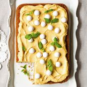 - Lusikoi koristelugeeliä (Piping gel) lautaselle. Sivele pullasudilla tasaisesti ympäri kakkua.