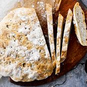 Lisää vehnäjauhot ja alusta taikinaa puuhaarukalla muutama minuutti. Lisää loput jauhot. Vaivaa taikinaa 5–10 minuuttia, se saa jäädä löysäksi. Lisää pinnalle vehnäjauhoja. Peitä kulho leivinliinalla ja nostata taikinaa vedottomassa paikassa 1–1 ½ tuntia.