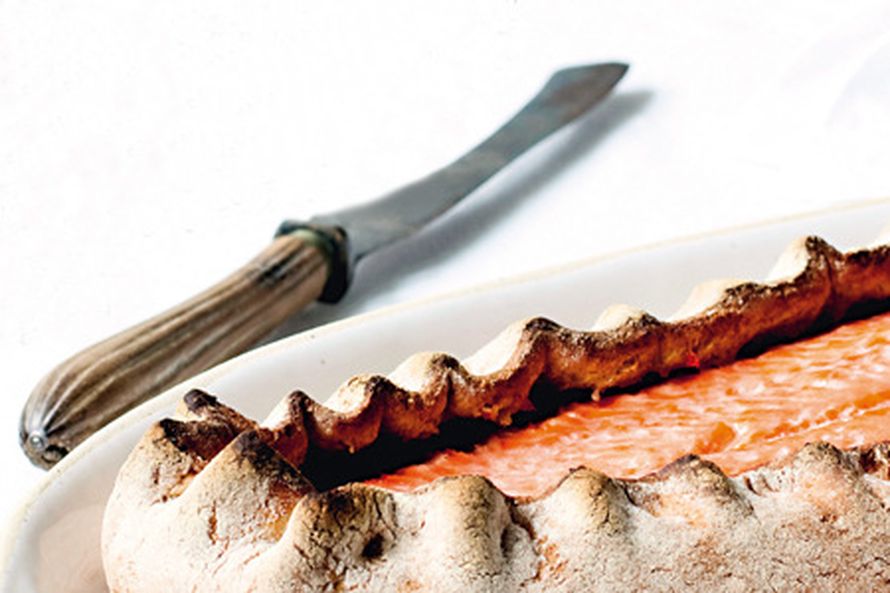- Nosta taikina kaulimen avulla leivinpaperilla vuoratulle uunipellille. Nosta lohifilee taikinan keskelle. Pyyhi pois ylimääräinen suola. Taittele taikinan reunat fileen päälle niin, että lohen keskusta jää näkyville. Nypi taikinan reunaan sormin aaltokuvio.