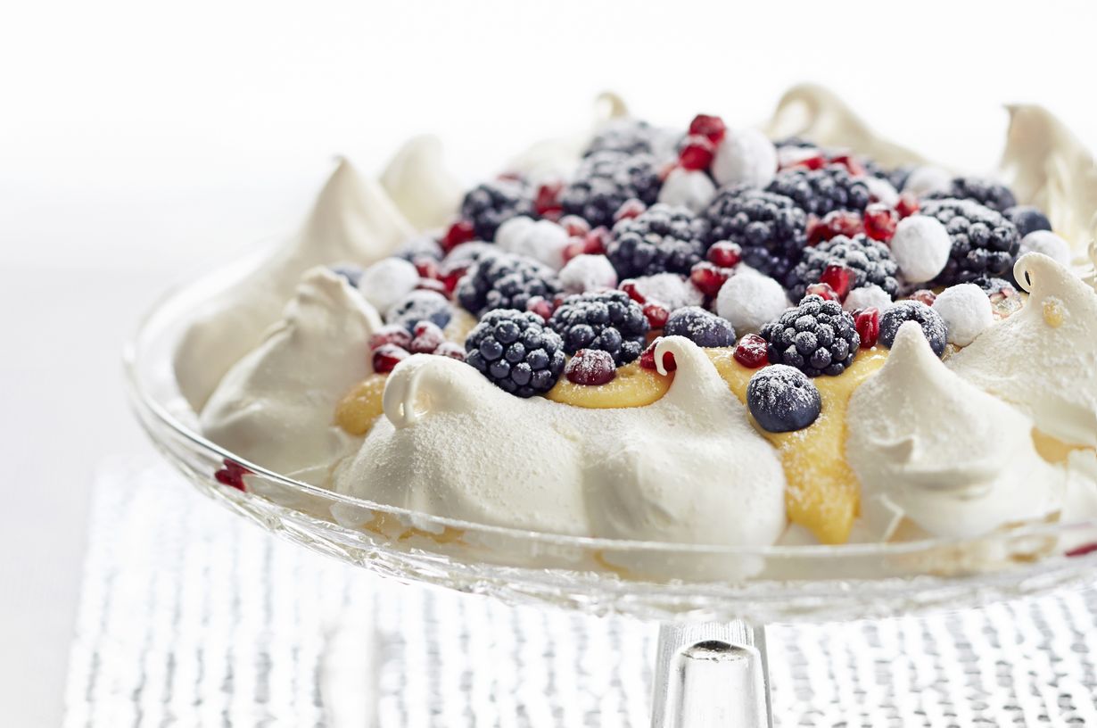 - Nosta marenkipohja varovasti kahden lastan avulla tarjoilualustalle. Täytä keskusta sitruunatahnalla. Lisää marjat ja granaattiomenan siemenet sekä mintunlehdet. Tuprauta marjoille tomusokeria teesiivilän läpi.