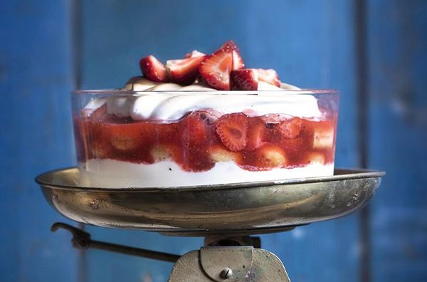 Näyttävään jälkiruokaan tulee kerroksittain mansikkakiisseliä, jugurttia, keksejä ja paahdettua marenkia. Komeus koristellaan tietysti tuoreilla mansikoilla. Katso resepti täältä.