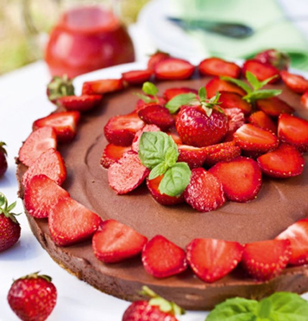 Suussasulava suklaakakku tehdään tuorejuustosta. Kakku nautitaan mansikkasoseen ja mansikoiden kera. Katso resepti täältä.