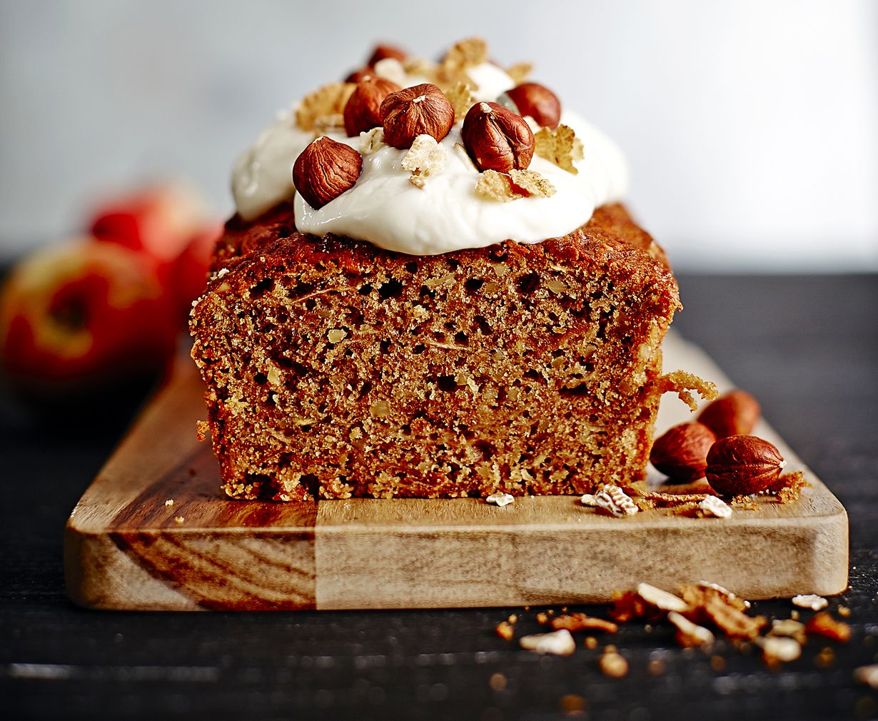 - Valmista täyte. Sekoita tuorejuusto ja rahka tasaiseksi sähkövatkaimella. Makeuta kuorrute hunajalla. Levitä kuorrute jäähtyneen kakun pinnalle. Koristele pinta juuri ennen tarjoilua myslillä ja pähkinöillä.