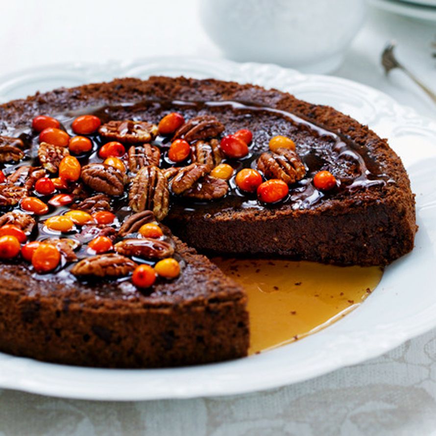 Nyt viikonlopuksi suklaakakkua! Koristele herkku tyrni- tai pihlajanmarjoilla.