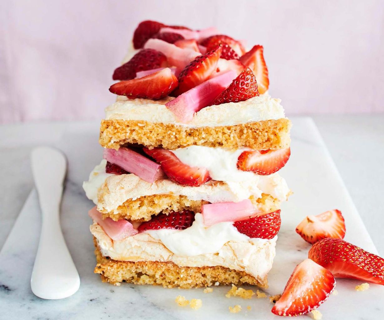 Gluteeniton brita-kakku täytetään raparperilla, mansikoilla ja maustetaan vaniljarahkalla. Tällä herkullisella kakulla hurmaat taatusti vieraat!