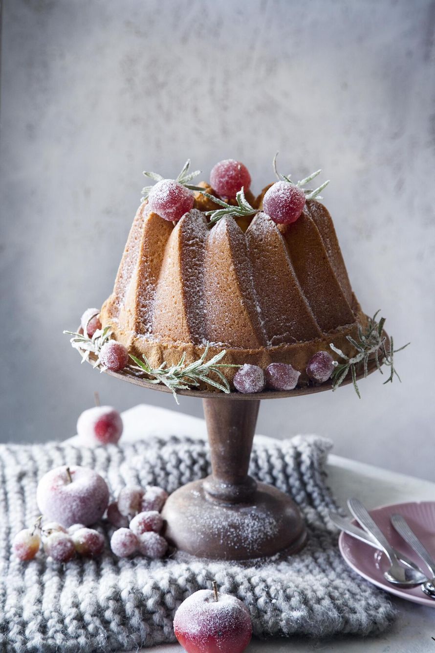 Kakun voi koristella kuvan tapaan tomusokerilla ja makeisilla tai huurretuilla marjoilla ja hedelmillä.
