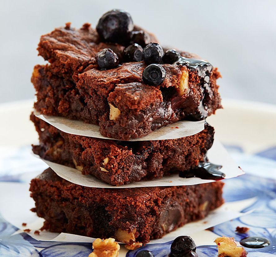 Näissä täyteläisissä leivonnaisissa on tumman suklaan lisäksi saksanpähkinöitä ja mustikoita.