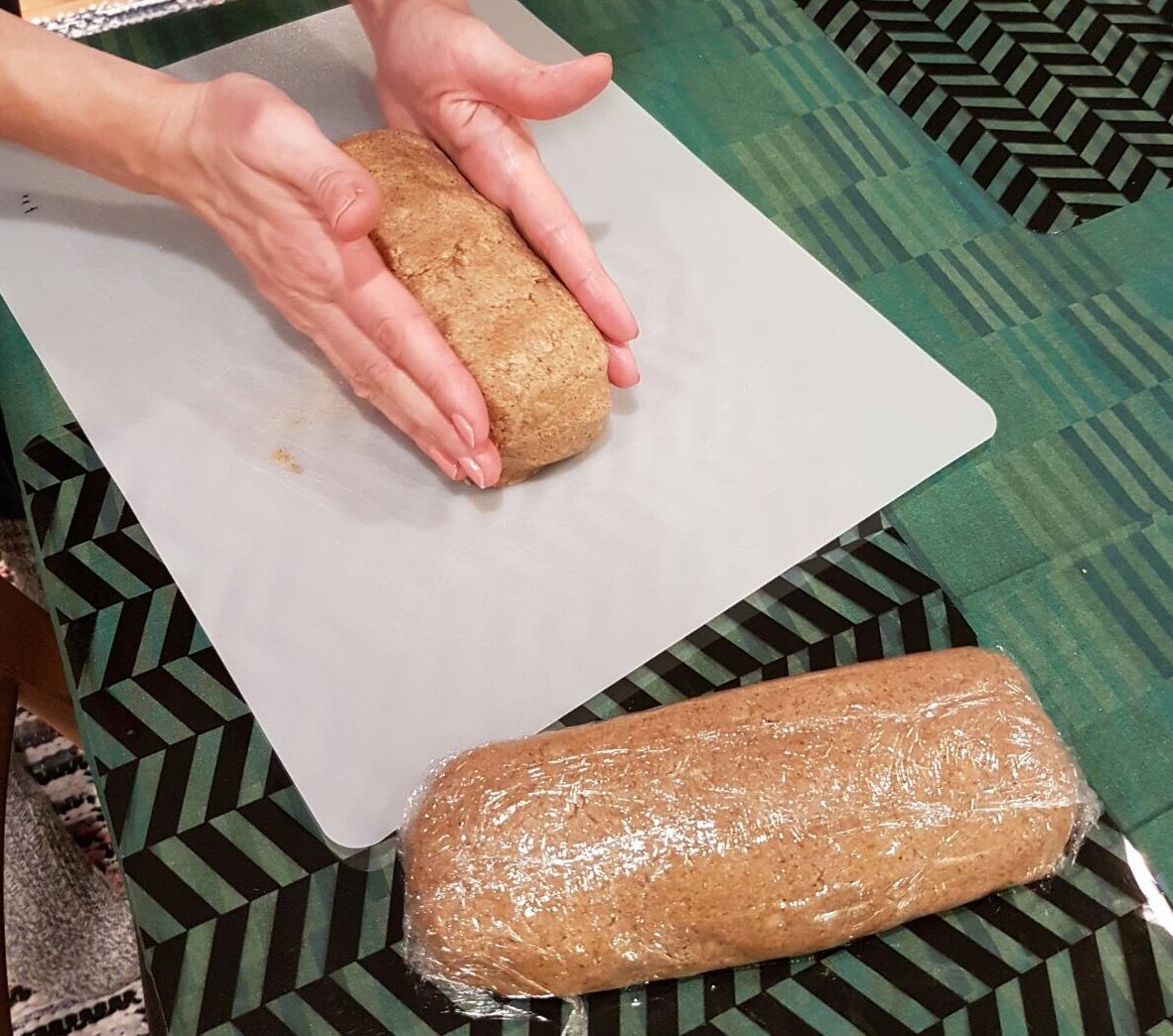 - Muotoile taikinasta kaksi halkaisijaltaan 5 cm:n pötkylää. Kääri ne kelmuun ja anna vetäytyä jääkaapissa yön yli tai vaikka useamman päivän, jos haluat.