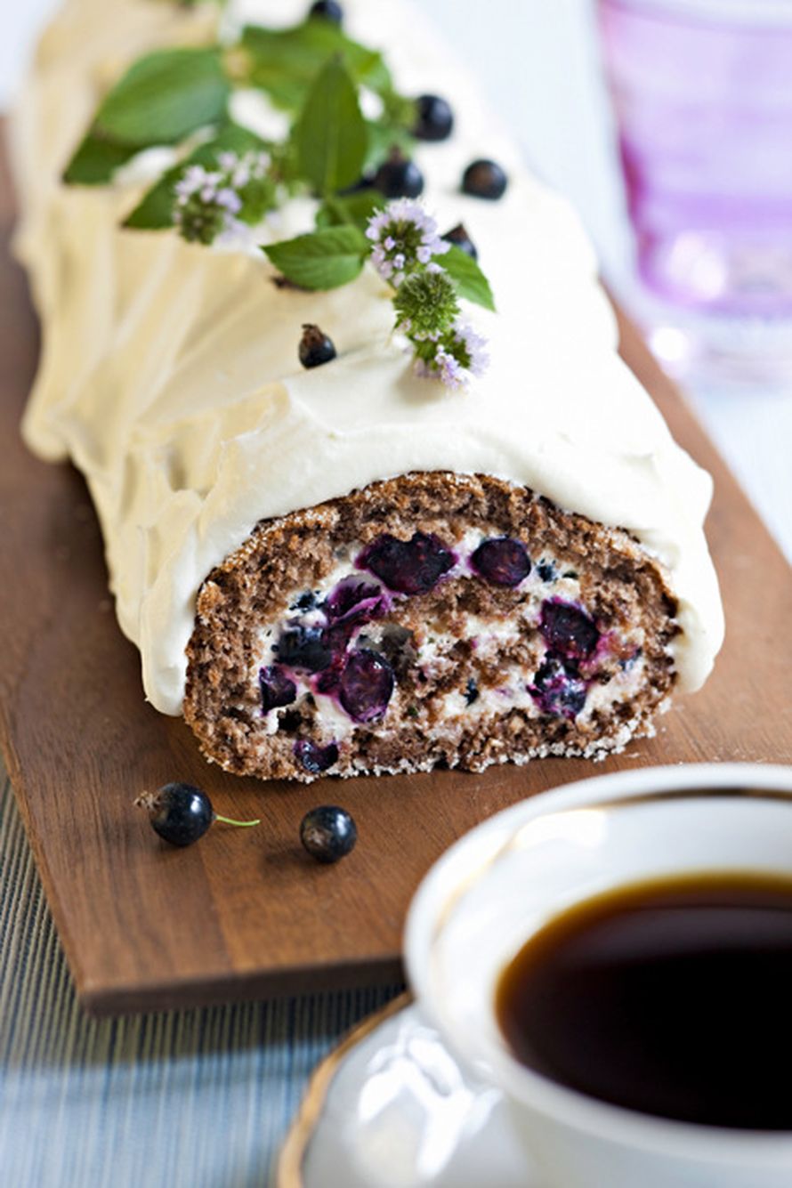 - Vatkaa kerma (+ sokeri) vaahdoksi ja sekoita siihen vaniljarahka ja hienonnetut mintunlehdet. Levitä täyte torttulevylle ja sen päälle marjat. Rullaa tiukasti kääretortuksi ja jätä saumakohta alaspäin.