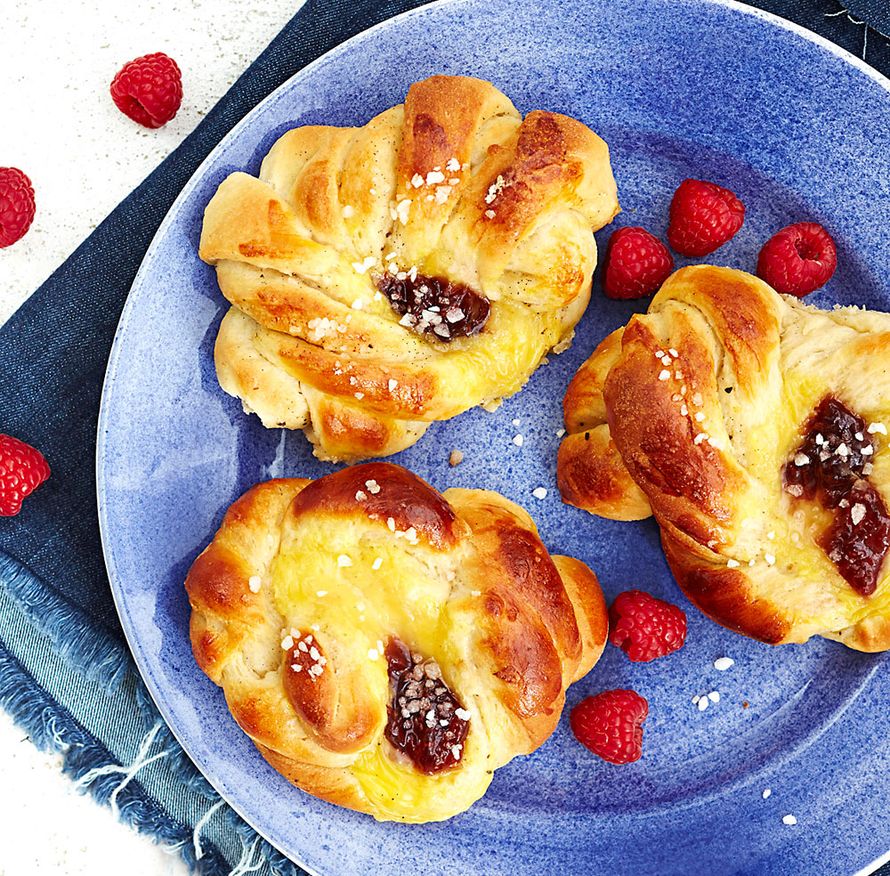 - Voitele pullat munalla. Lusikoi keskelle vaniljakastiketta ja vadelmahilloa. Ripottele raesokeria.