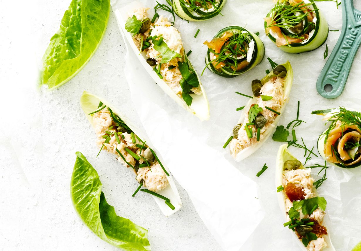 - Lusikoi lehtien päälle lohitahnaa ja koristeeksi silputtuja yrttejä.