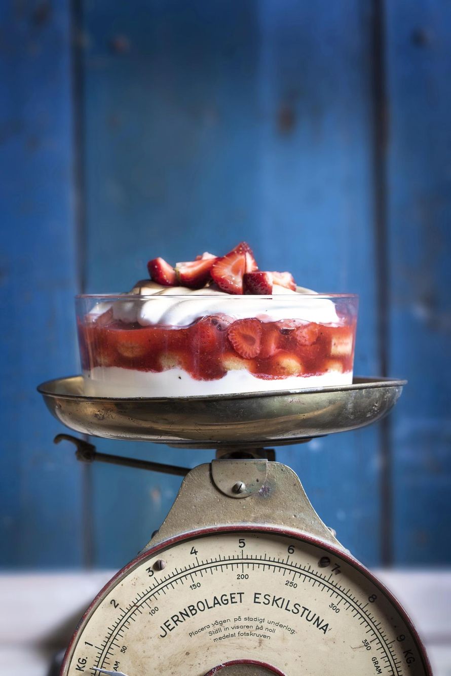 Mansikkatrifleen tulee kerroksittain jugurttia, kiisseliä ja keksejä sekä päälle paahdettua marenkia.