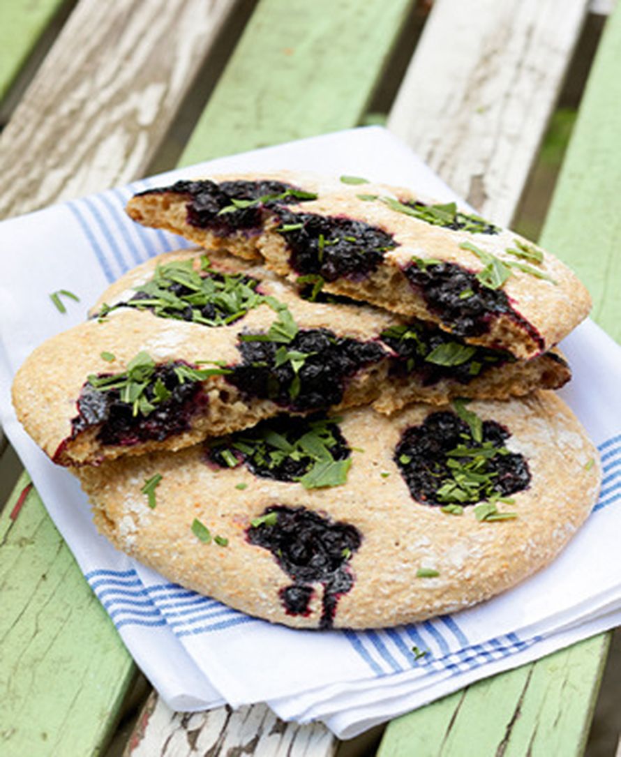 Painele leipien pintaan peukalolla koloja ja täytä ne mustikkaseoksella.