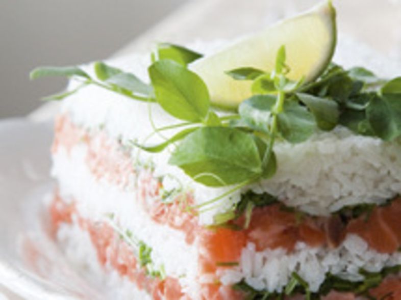 Riisi-lohikakku – Moderni versio perinteistä voileipäkakusta on juhlava riisipohjainen kalakakku.