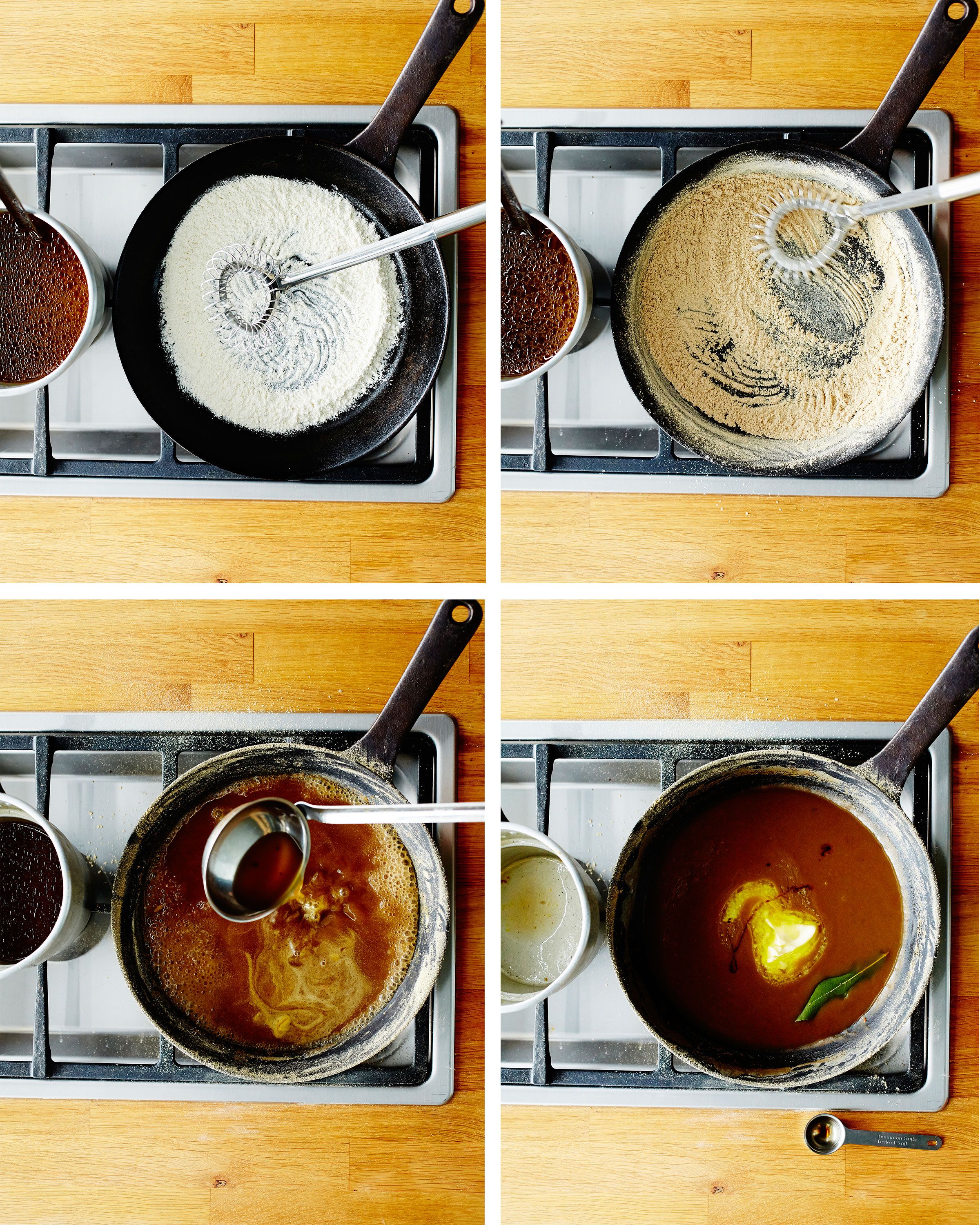 - Mittaa vehnäjauhot paksupohjaiselle, mieluusti valurautaiselle paistinpannulle. Nosta pannu kylmälle levylle. Kuumenna pannu ja sekoita jauhoja koko ajan vispilällä. Jauhot alkavat vähitellen paahtua ja ruskistua, pannusta ja hellasta riippuen noin 5 minuutissa. Varo kuitenkin polttamasta jauhoja; pannun kuumentuessa se tapahtuu herkästi.