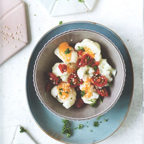 • Paahda sillä välin kolmannes kukkakaalinupuista. Sipaise pintaan oliiviöljyä ja laita palat uunipellille 275-asteisen uunin ylälämpöön noin 5 minuutiksi eli kunnes ne saavat hieman väriä.