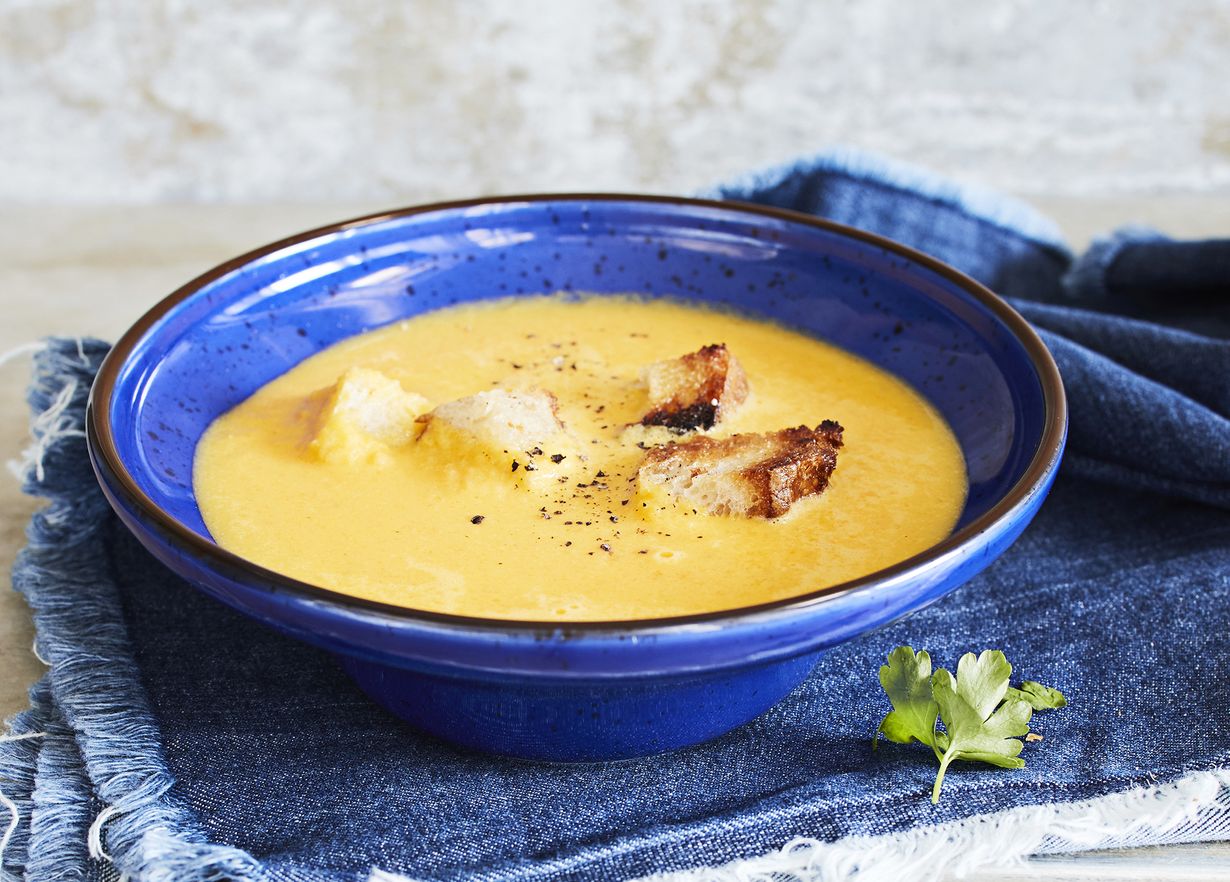 - Paahda leipäkrutonkeja paistipannulla ja lisää niitä tarjoiluvaiheessa keiton pinnalle.