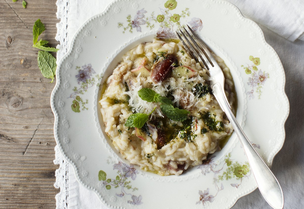 - Sekoita lopuksi risoton joukkoon minttuöljy ja raastettu parmesaani.