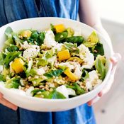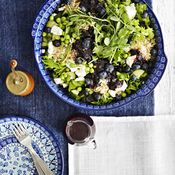 - Kumoa salaatti tarjoiluvatiin. Lisää salaatin pinnalle kuorittuja pistaasipähkinöitä ja paloiteltua mozzarellaa.