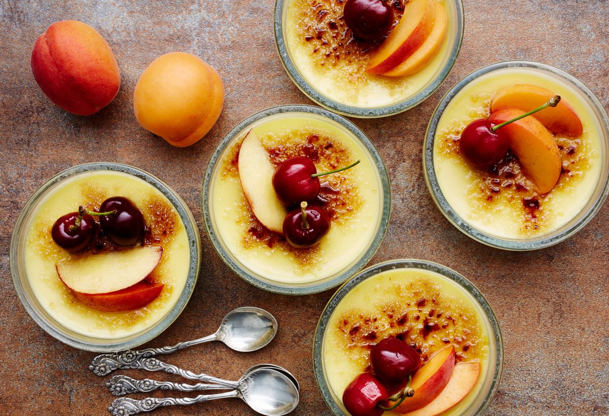 Katalonialainen paahtovanukas on ranskalaisen crème brûléen serkku. Sen pinta paahdetaan rapeaksi ja koristellaan aprikooseilla ja kirsikoilla.