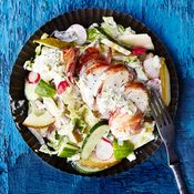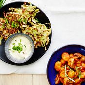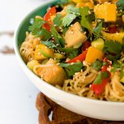 - Levitä kasvikset tarjoiluvadille ja seesamibroileiripalat kasvisten päälle.