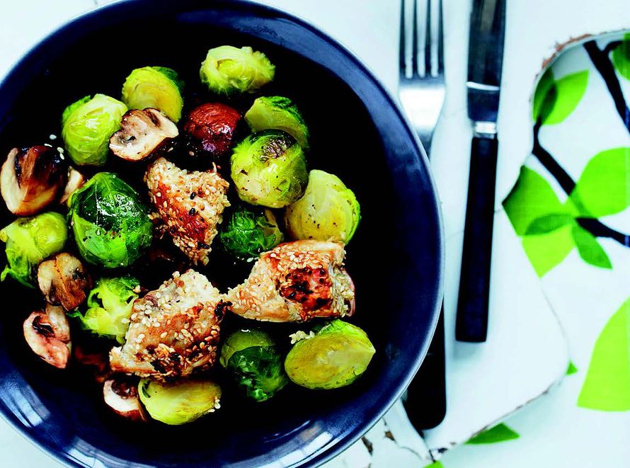 Seesamsiemenillä kuorrutettu broileri saa kaverikseen maukkaita ruusukaaleja ja herkkusieniä.