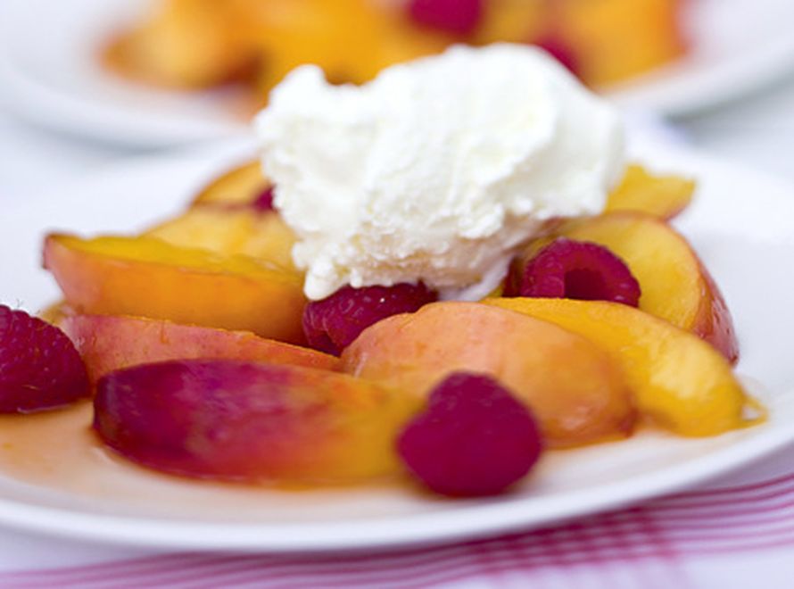1 rkl öljyä tai voita5–6 isoa nektariinia lohkottuinanoin 1 dl vaahterasiirappiatuokkonen vadelmia½ l vaniljajäätelöä