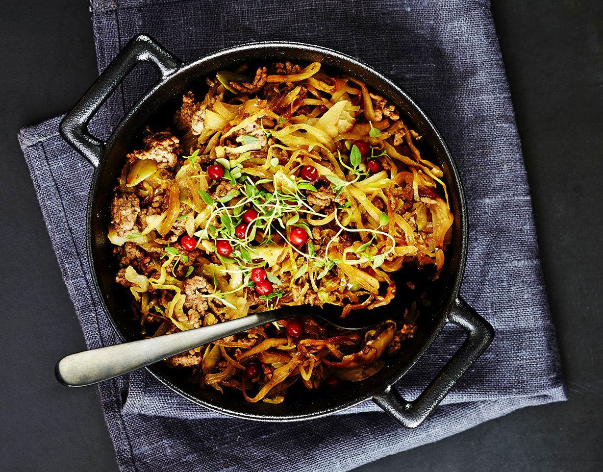 - Lisää pannulle kaali ja hauduta 5 minuuttia. Sekoita liha kaalin joukkoon. Makeuta hunajalla tai siirapilla. Hauduta 15 minuuttia.