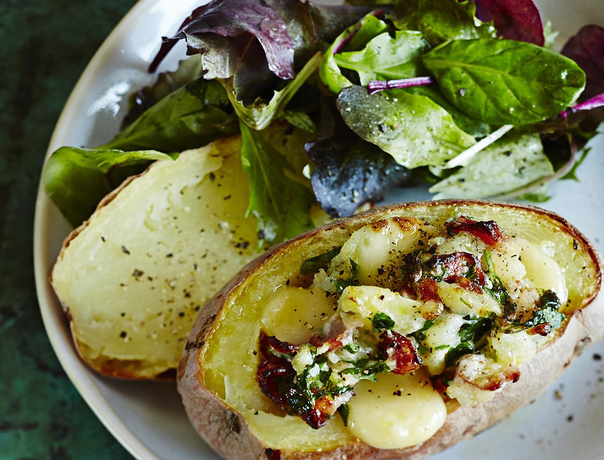 - Kypsennä perunoita noin 10 minuuttia uunissa, eli kunnes juusto on hieman sulanut. Mikrossa kypsennysajaksi riittää yksi minuutti.