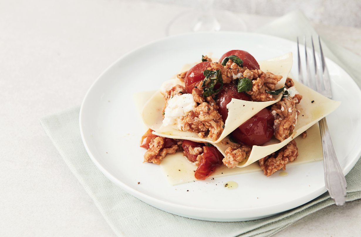 - Kokoa annos. Nosta lasagnelevy suoraan lautaselle. Lusikoi päälle kastiketta ja murennettua vuohenjuustoa. Nosta päälle lasagnelevy. Jatka kerros kerrokselta. Rouhi pintaan mustapippuria.