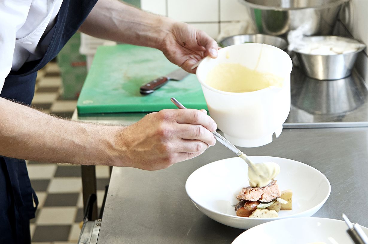 Uusin makuelämys on juuri valmistumassa Loopin keittiössä. Lämminsavulohta, palmusiirapilla maustettuja haudutettuja juureksia ja hollandaisekastiketta.