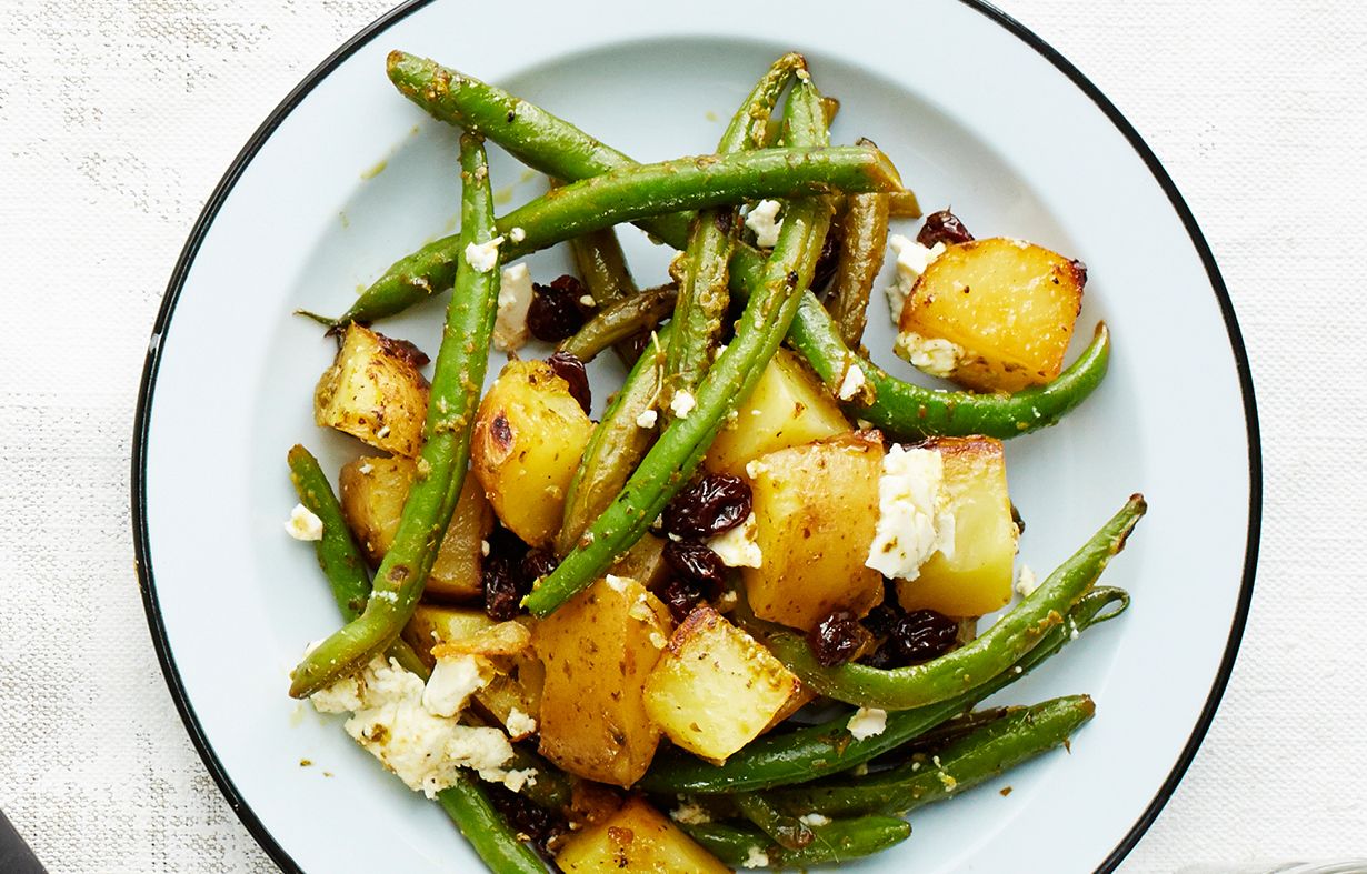 - Lisää rusinat, pesto, sitruunamehu ja murennettu feta. Mausta pippurilla ja lisää suolaa maun mukaan.