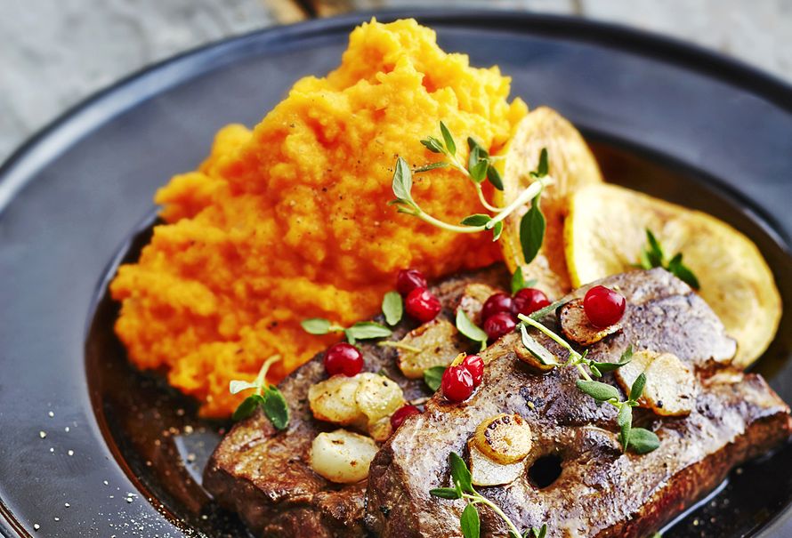 A-vitamiinin täydentämiseksi kannattaa ateriaksi tehdä maksapihvejä, joiden kanssa tarjotaan herkullista bataatti-porkkanamuhennosta.