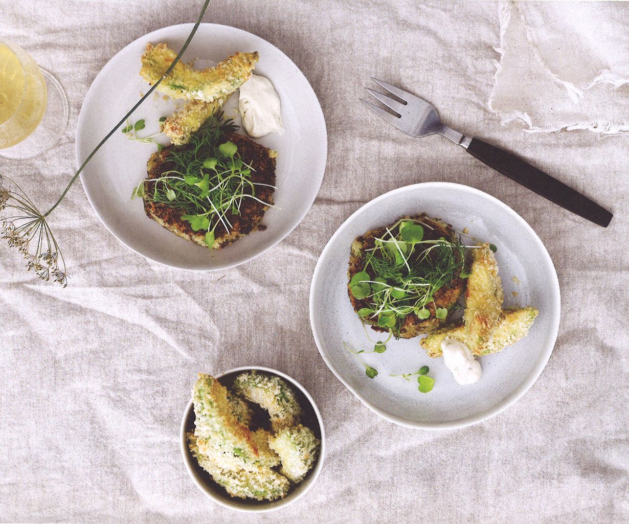 Sekoita muusin joukkoon jauhot, hienonnettu nyhtökaura, hienonnettu tilli sekä raastettu sitruunankuori. Mausta pippurilla, Muotoile 8 pihviä ja kierittele ne kauttaaltaan korppujauhoissa. Anna pihvien vetäytyä kylmässä noin 30 minuuttia. Paista reilussa öljyssä noin 4 minuuttia per puoli. Valut talouspaperin päällä.