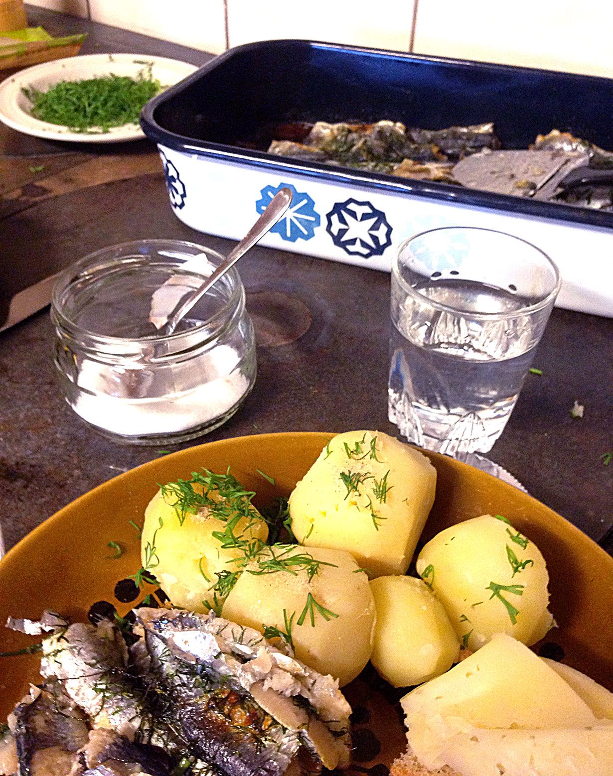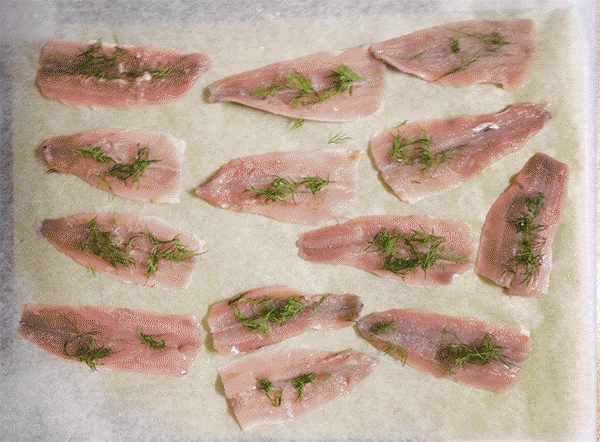Maustoin, taittelin takaisin kalanmuotoon ja ladoin voilla voideltuun vuokaan reilut 600 g silakkafileitä. Jälkikäteen huomasin poikenneeni ohjeesta, sillä sirottelin tilliä myös fileiden sisälle enkä vain voinokareiden kera niiden pinnalle. Päätin antaa asian olla – uskon että myös kenraaliluutnantti Grandell olisi antanut virheen anteeksi.