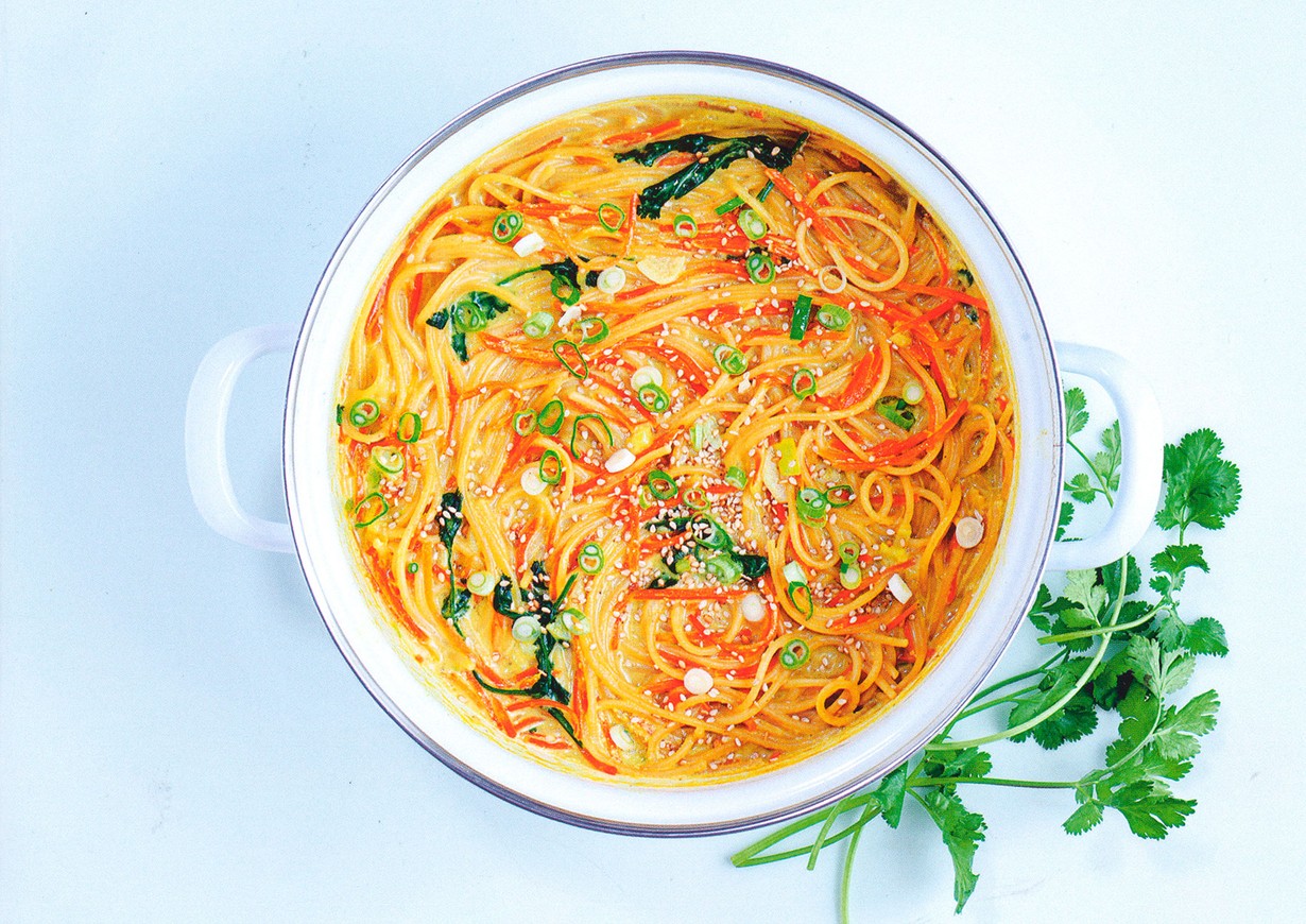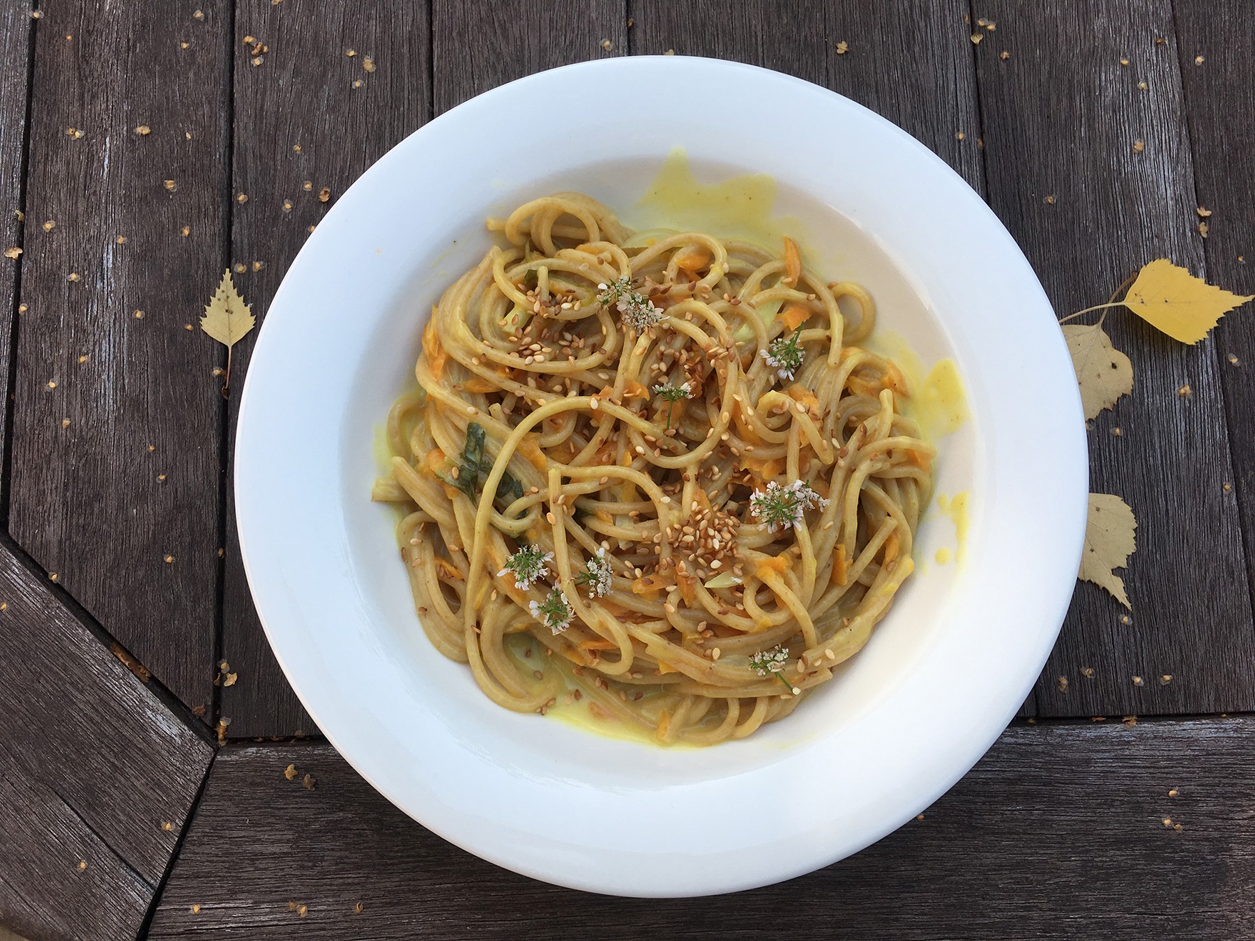 Pastasta tuli pehmeän täyteläistä. Kookosmaito, curry ja rapsakat seesaminsiemenet toimivat mainiosti yhdessä. Reseptissä ei ole lainkaan eläinperäisia raaka-aineita.