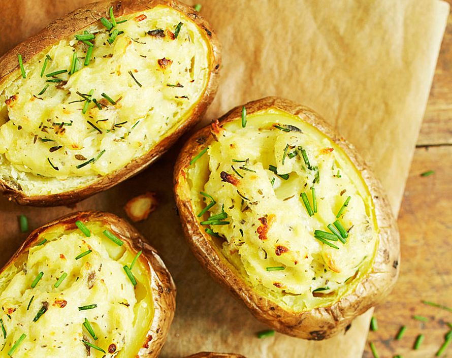 - Pese, kuivaa ja öljyä perunoiden pinta. Kypsennä perunoita 220-asteisessa uunissa 45 minuuttia. Anna jäähtyä, kunnes voit käsitellä perunoita.
