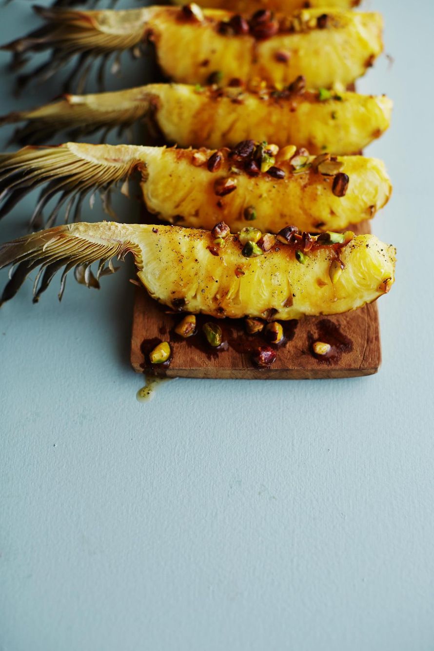 - Sulata voi ja lisää joukkoon kardemumma. Valele ananaksen pinta maustevoilla. Valuta pinnalle tummaa siirappia. Rouhi pistaasipähkinät ja ripottele ne ananaslohkojen pinnalle.