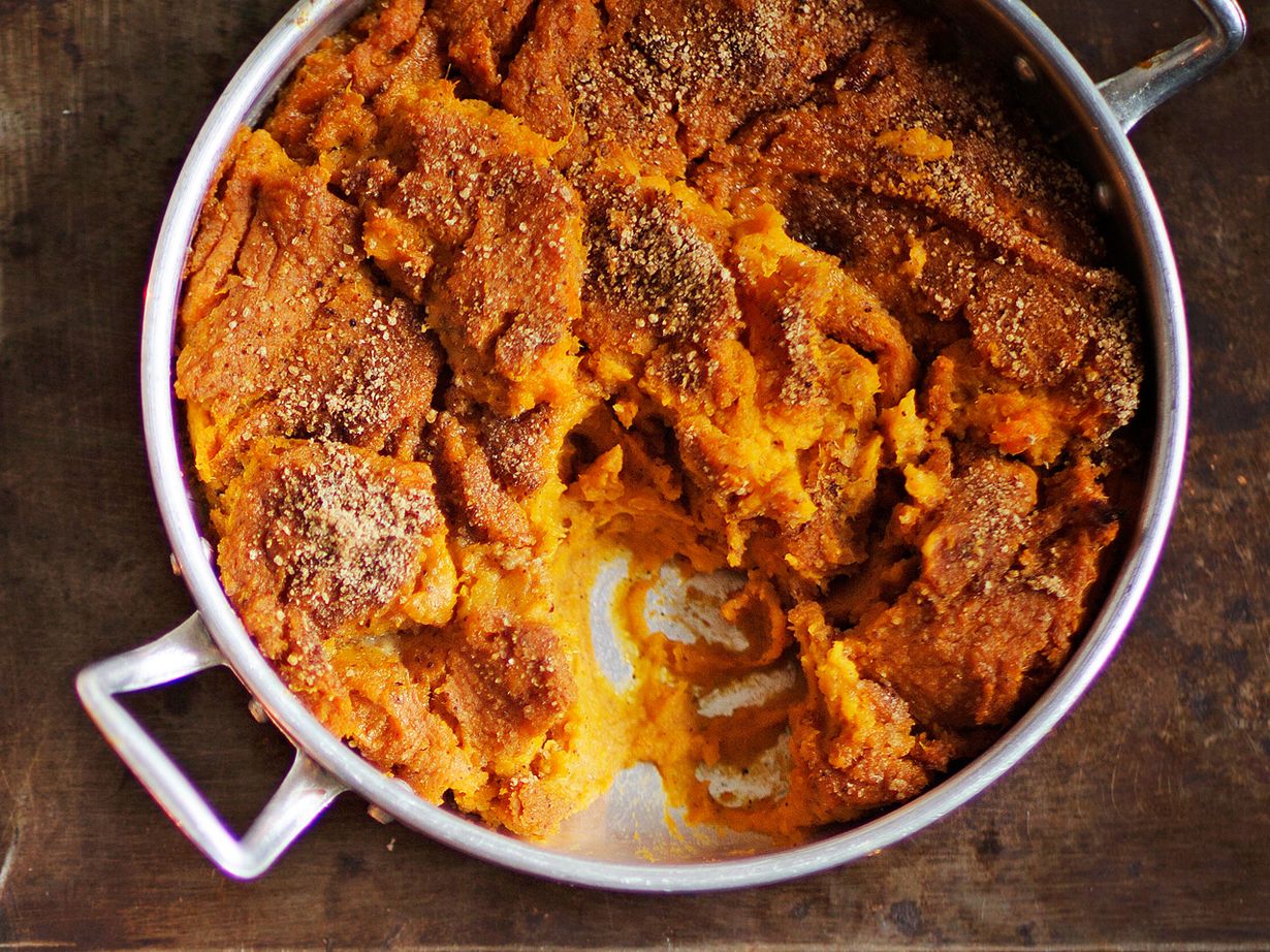 - Kuori ja lohko bataatti. Keitä lohkot niukassa vedessä kypsiksi. Valuta vesi pois ja soseuta palat.