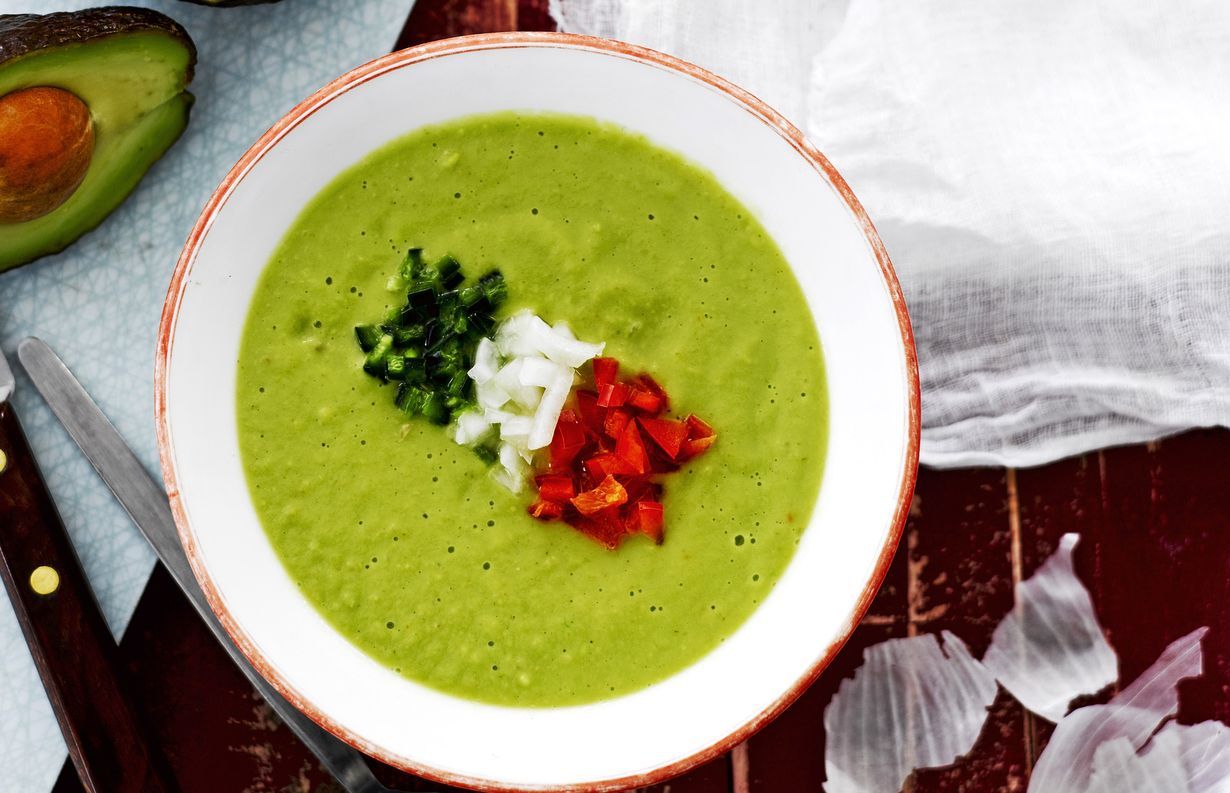 Ihanan pehmeä avokadokeitto sopii alkupalaksi, mutta myös syötäväksi ihan yksistäänkin. Herkullinen ja terveellinen keitto koristellaan vihreällä ja punaisella paprikalla sekä sipulilla, joista muotoillaan keiton pinnalle hauska Meksikon lippu.