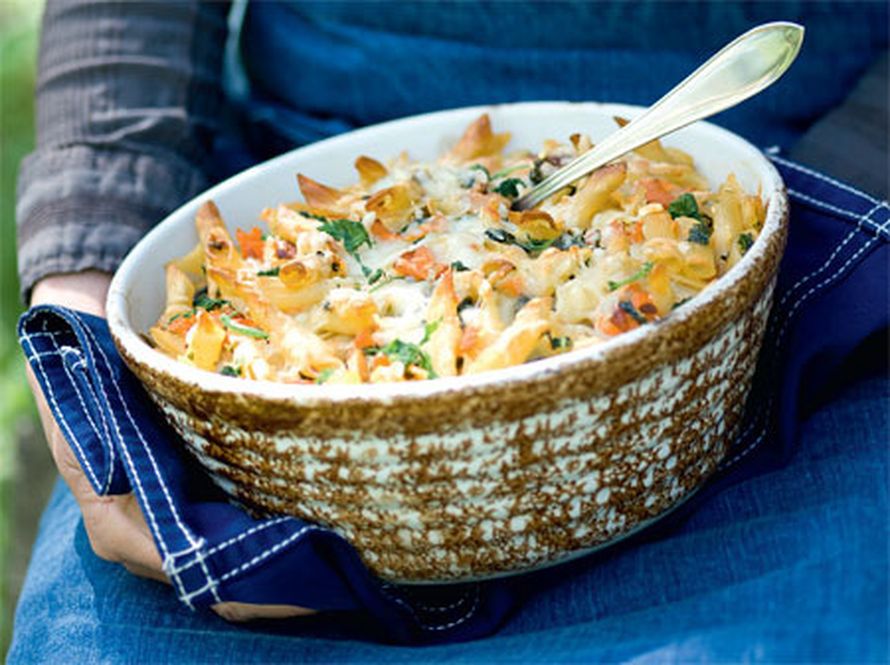 - Paloittele kala ja poista ruodot. Kumoa pasta ja kalapalat uunivuokaan. Sekoita kevyesti.