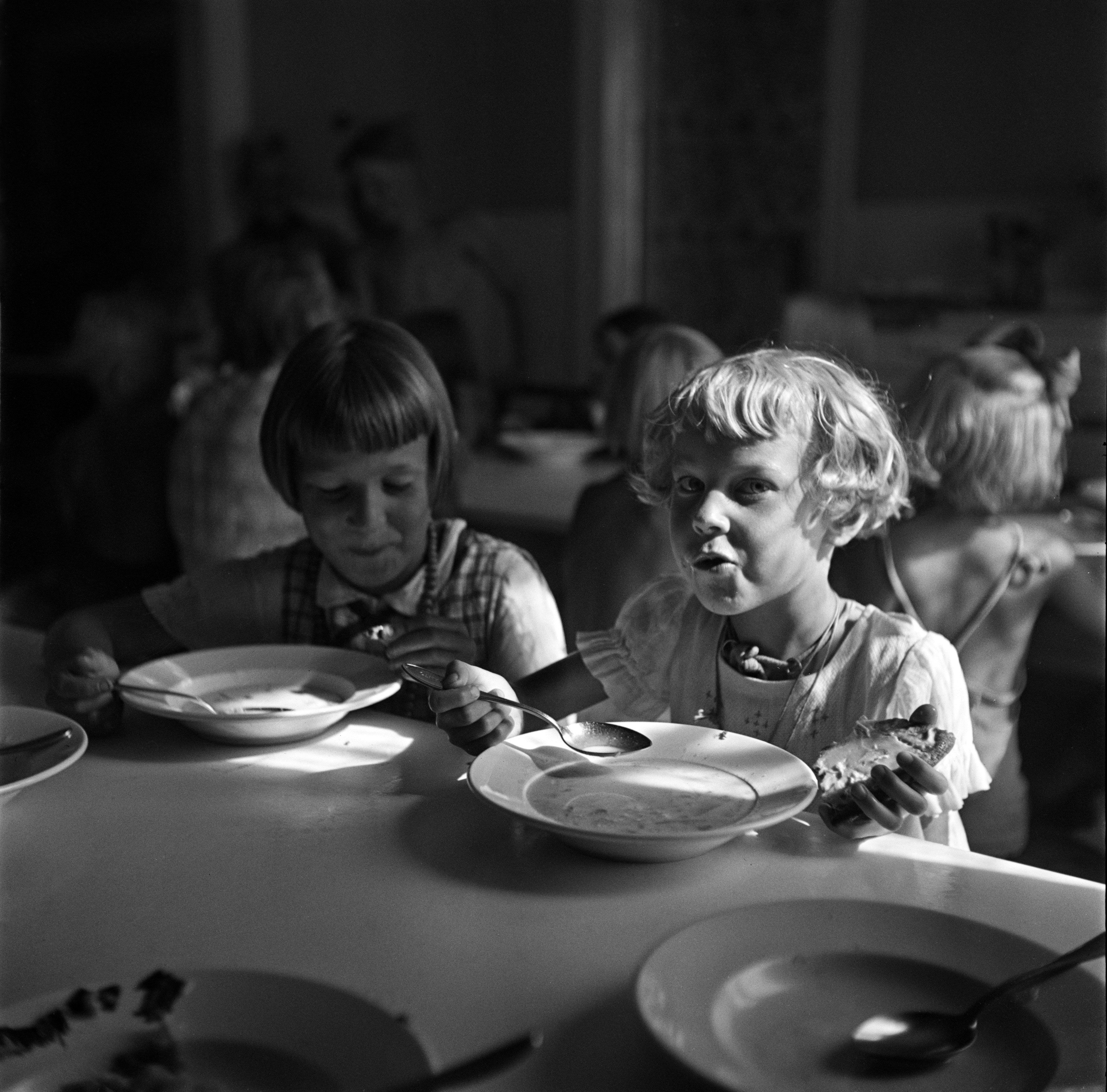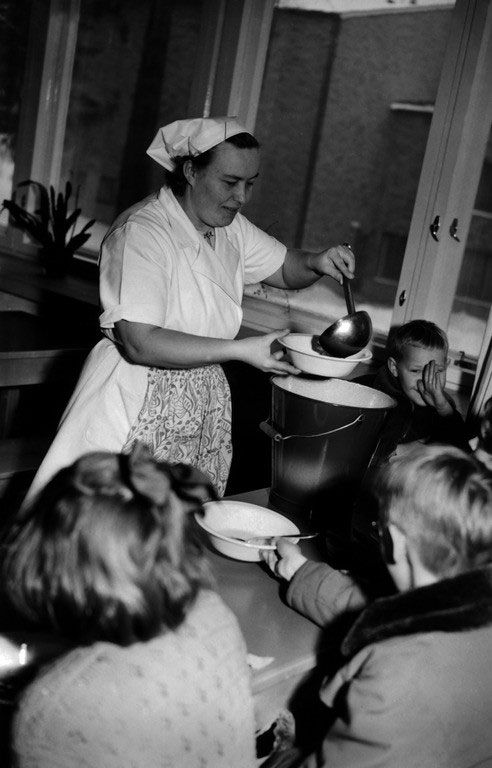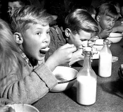 Vaikka ruoka saatiin koulusta, maito ja leipä tuotiin kotoa. Myös lautanen ja lusikka piti useimmiten olla omasta takaa.