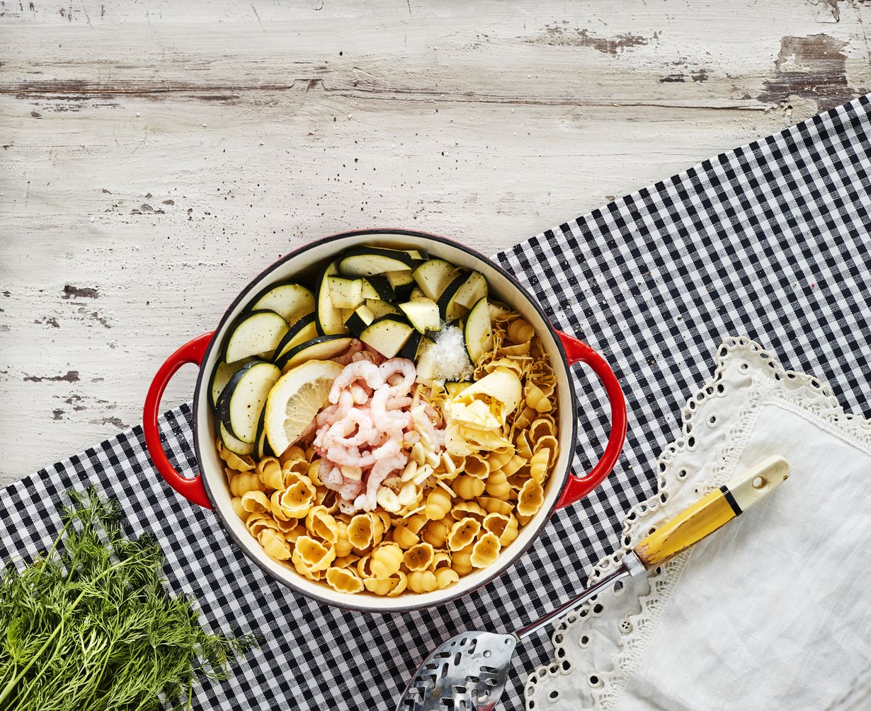 Voiko pastan teko olla enää helpompaa? Herkullinen katkarapu-kesäkurpitsapasta syntyy vartissa