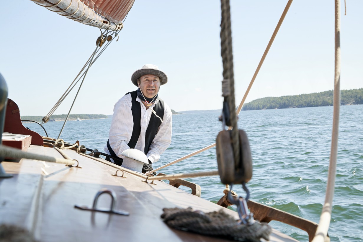 Sami katselee löysänä lepattavaa purjetta päätään puistellen. Saarten välissä on niin tyyntä, ettei tuuli riitä liikuttamaan venettä.