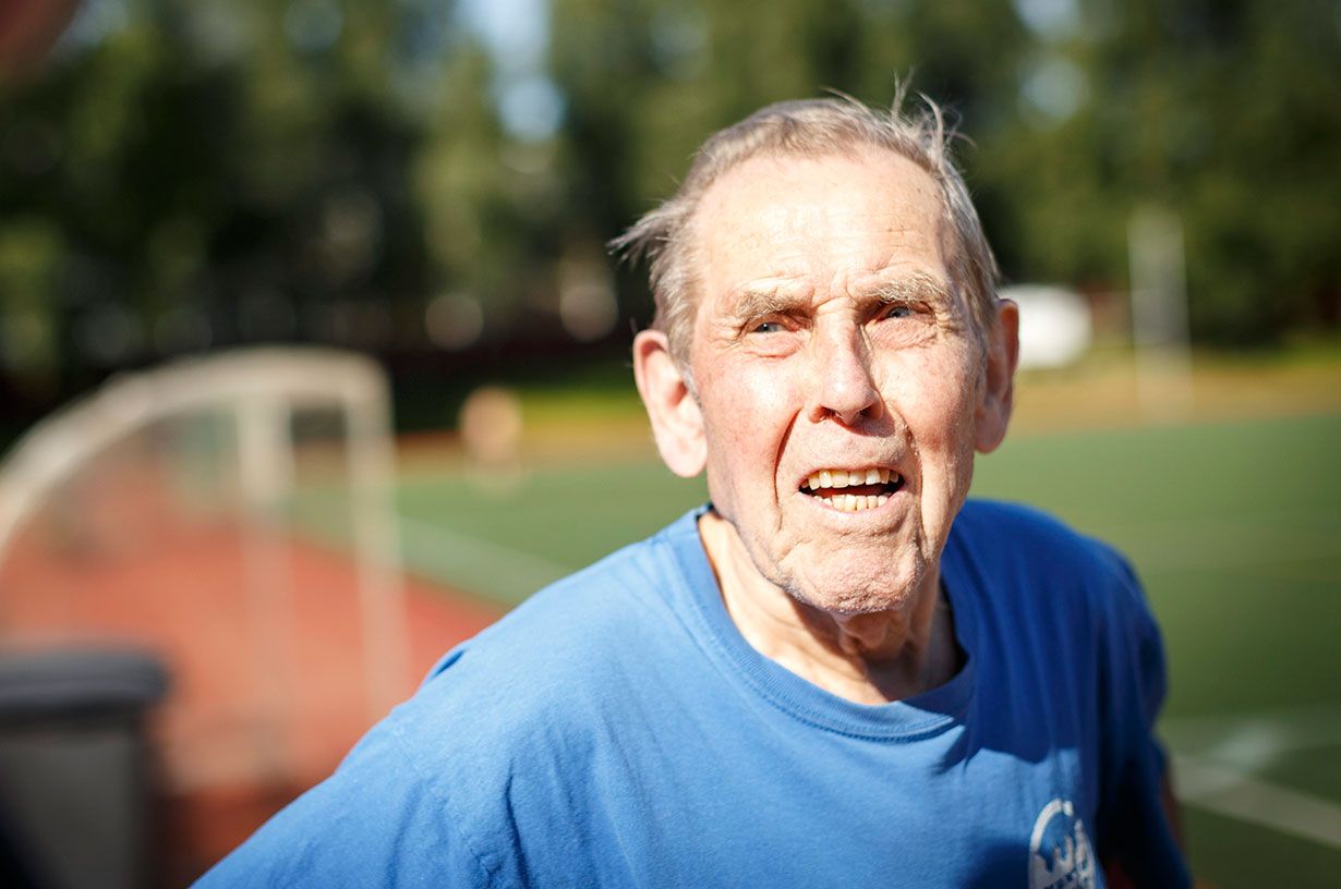 Tamperelainen Aatos Sainio jäi monen mieleen Linnan juhlien vastaanotolta, jossa 90-vuotias kolmiloikkaaja kertoi tuoreesta maailmanennätystuloksestaan: 7,10 metriä. Aatos Sainio treenaa edelleen.