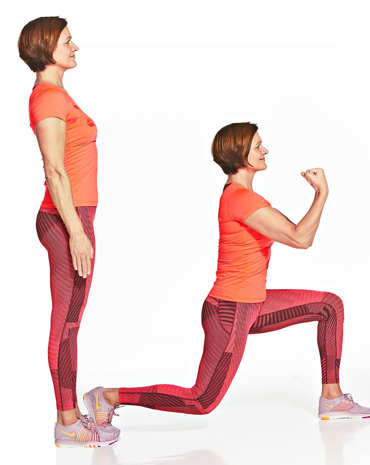 Muista! Pidä etummainen polvi kantapään yläpuolella ja pidä takimmainen polvi, lantio ja hartia samassa linjassa. Selkä on ryhdikäs ja vatsa tiukka.