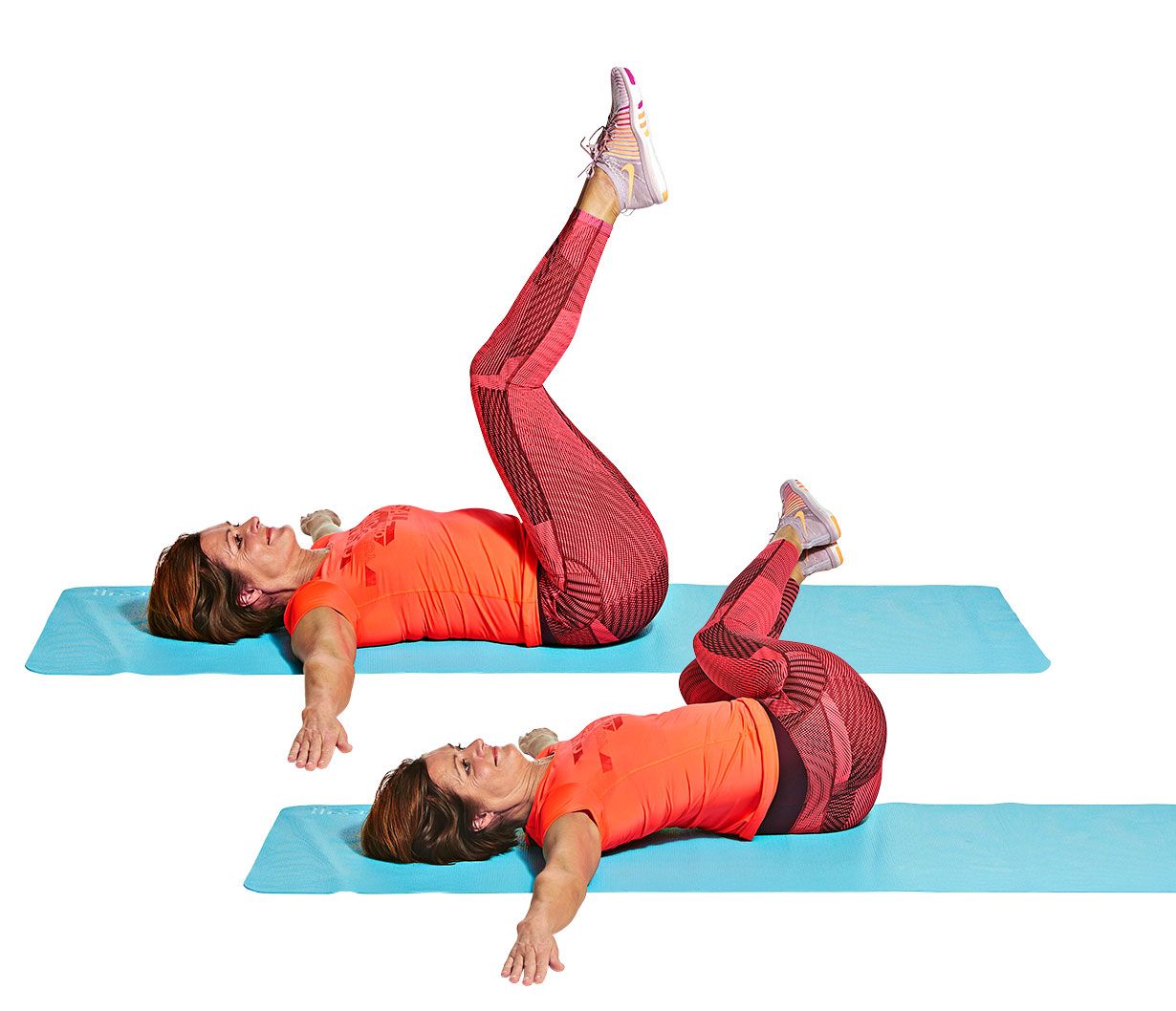 Asetu selällesi. Pidä jalat hieman koukussa vatsan päällä ja kädet sivulla vaakatasossa, kämmenet alaspäin. Vie koukussa olevia jalkoja rauhallisesti sisäänhengityksellä vasemmalle ja uloshengityksellä vedä jalat takaisin keskelle. Tee sama toiselle puolelle.