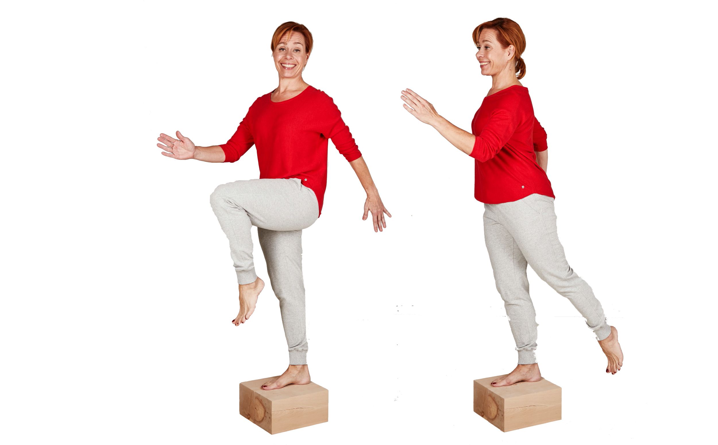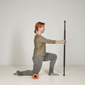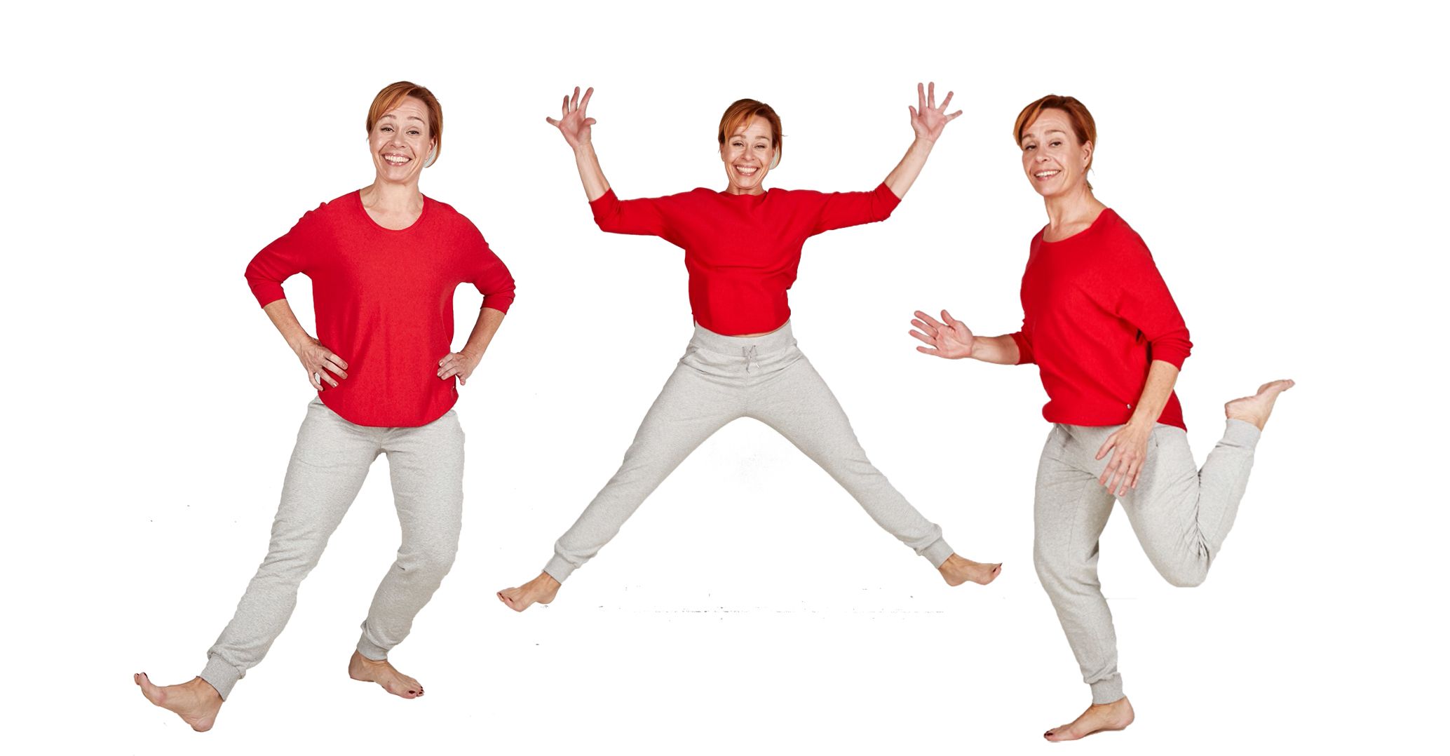 - Läpsäytä kädet yhteen polven alla, tee haara-perushyppyjä tai askelkyykkyjä eteen ja sivuille.