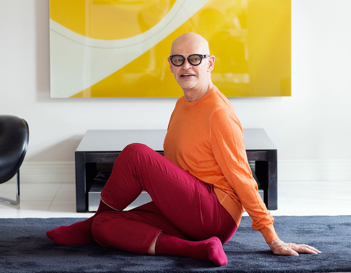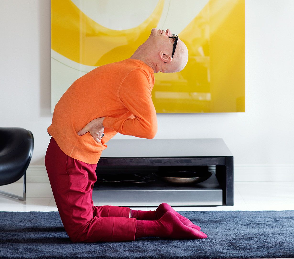Jorma Uotinen käy istumaan matolle olohuoneensa lattialle. Valokuvaaja tähtää oviaukon läpi toisesta huoneesta.