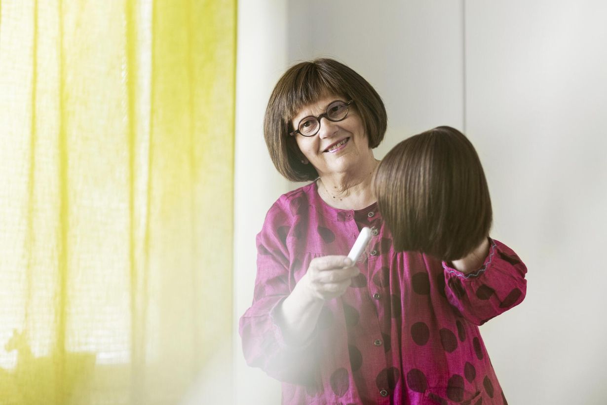 Kuusi vuotta sitten ostin ystävän häihin ensimmäisen peruukkini. Nykyään minulla on neljä peruukkia, joista kahta yleensä käytän vuorotellen. Peruukki on helppo ratkaisu hiusongelmaan: minulla on aina tukka hyvin! Ihmiset eivät näytä juuri huomaavan peruukkiani. Sen väri sopii hyvin silmieni ja ihoni väriin.